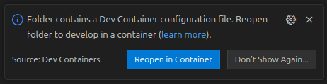 Visual Studio Code will automatically detect the devcontainer and prompt to "Reopen in Container" (bottom right corner) - click on it.